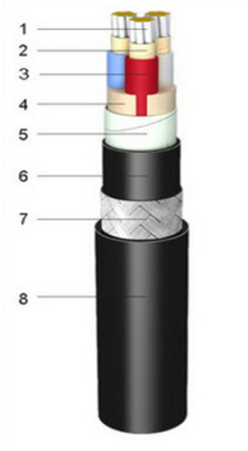 1-Conductor Stranded circular tinned Copper class2 IEC 60228 2-Fire resistant lay Mica tape 3-Insulation XLPE 4-Filler (if necessary) 5-Tape 6-Inner sheath PO 7-Amour Metal wire braid (Code 8# copper wire) (Code 9# tinned copper wire) 8-Outer sheath PO