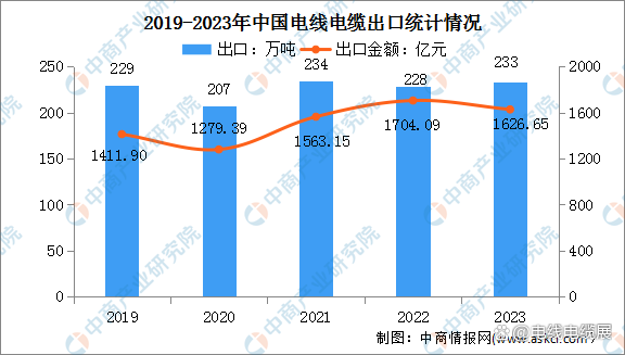 我國(guó)電線電纜的出口量在全球市場(chǎng)中占有相當(dāng)大的份額,出口量逐年增長(zhǎng),東南亞、中東、非洲、歐洲等地區(qū)是主要出口市場(chǎng)。2023年我國(guó)電線電纜出口量233萬(wàn)噸,同比增長(zhǎng)2.8%。從金額方面來(lái)看,2023年我國(guó)電線電纜出口金額1626.65億元,同比下降3.2%。