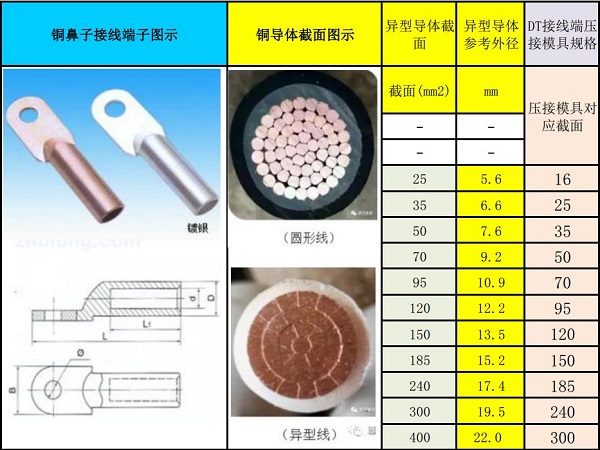 異型導體相對圓型導體因填充系數由90%提高至98%,導體外徑減小5%~8%,選用對應規格的國標接線端子時,可在壓接模具選用時比此規格導體小一個規格進行壓接;